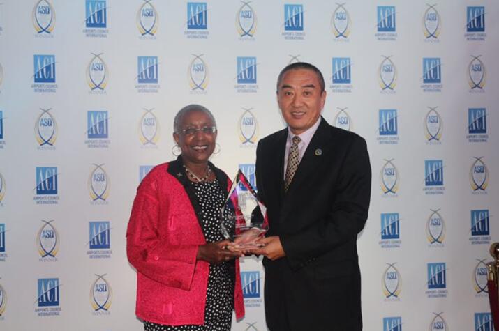 美兰机场斩获ASQ三项世界大奖。图为王贞董事长上台领奖。