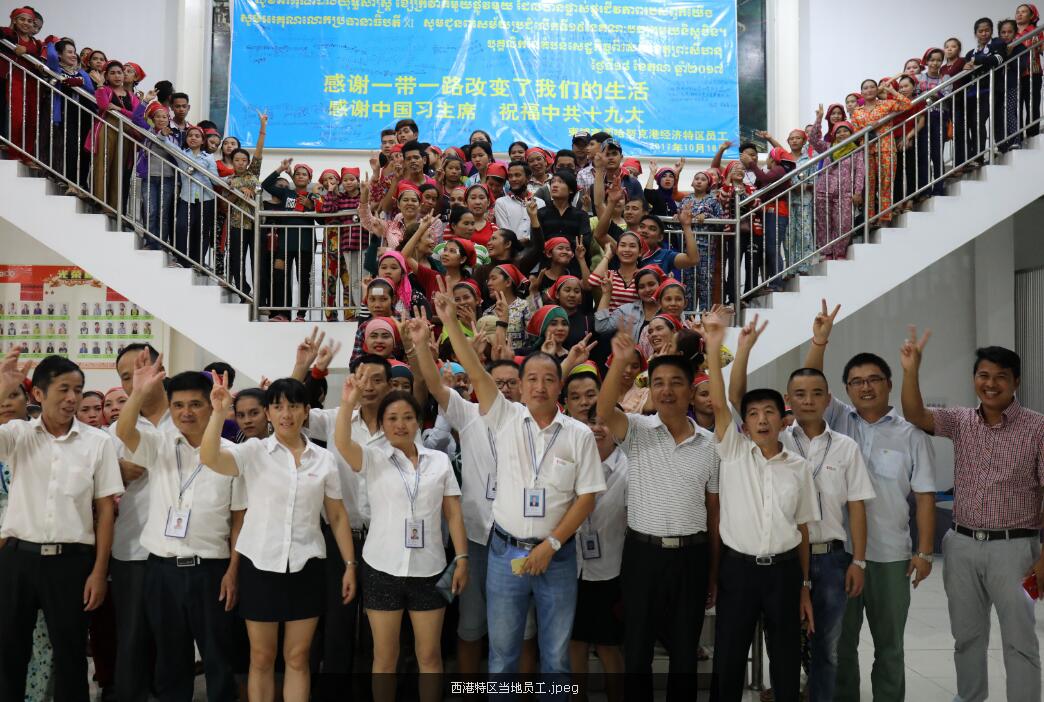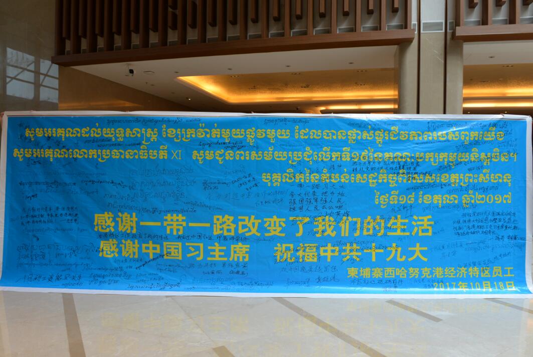 当天下午,红豆集团柬埔寨公司蒋克兴受西港特区当地员工的委托,从柬埔寨搭乘航班抵达北京。向江苏代表团转送了这一特殊的礼物:在一个长6米、宽2米的巨大条幅上面,200多名柬埔寨西港特区当地员工签名留言。蓝色条幅上用中柬两国文字,写着三句话:“感谢‘一带一路’改变了我们的生活!感谢中国习主席!祝福中共十九大!”