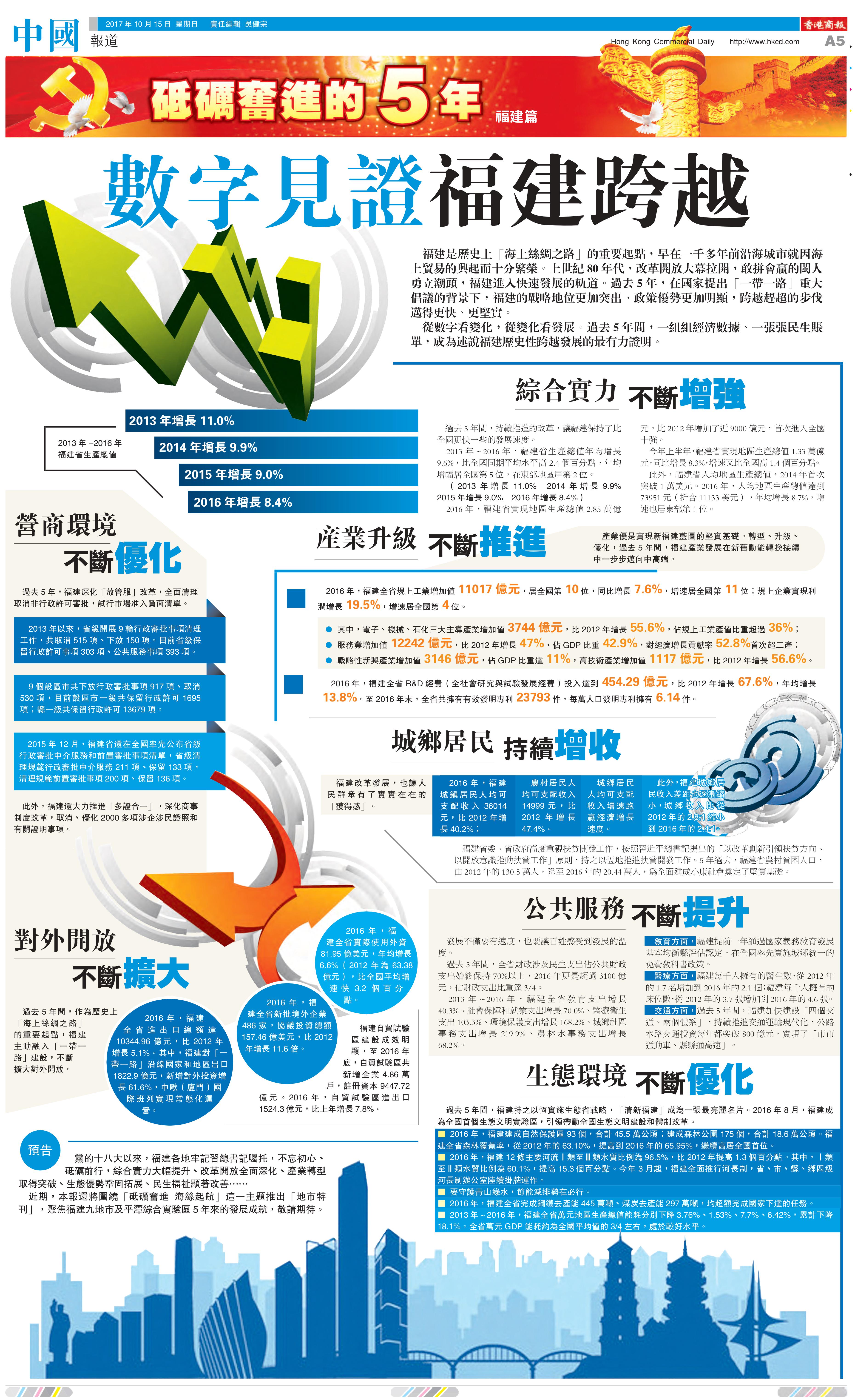 【香港商报网讯】記者田琴、鍾鍇报道:福建是歷史上「海上絲綢之路」的重要起點,早在一千多年前沿海城市就因海上貿易的興起而十分繁榮。上世紀80年代,改革開放大幕拉開,敢拼會贏的閩人勇立潮頭,福建進入快速發展的軌道。過去5年,在國家提出「一帶一路」重大倡議的背景下,福建的戰略地位更加突出、政策優勢更加明顯,跨越趕超的步伐邁得更快、更堅實。