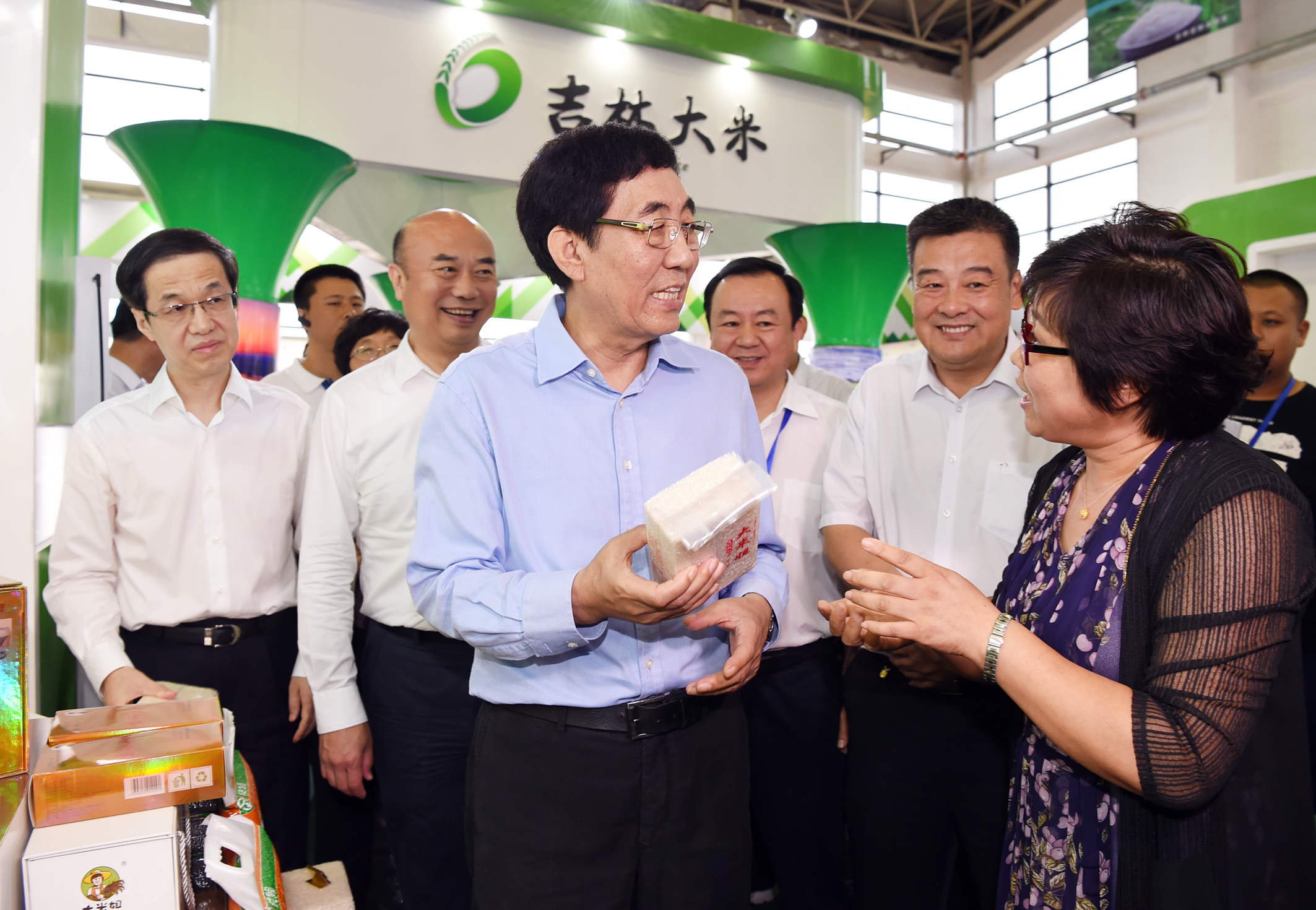 吉林省委书记巴音朝鲁(前左)、省长刘国中(后左二)、省委副书记高广滨(后左一)在吉林省粮食局副局长张宏明(后右二)陪同下视察农博会吉林大米馆。