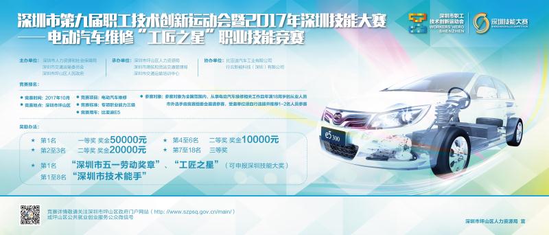 【香港商报网讯】记者焦家志、通讯员石志飞报道:为了进一步加强电动汽车行业技能人才培养,引领新能源汽车产业基地提质发展。由深圳市人力资源和社会保障局、深圳市交通运输委员会、深圳市坪山区人民政府联合主办的2017年深圳技能大赛——电动汽车维修“工匠之星”职业技能竞赛将于10月28日至29日在位于坪山区的比亚迪汽车工业有限公司开赛,届时来自全国140名电动汽车维修行业的能工巧匠将齐聚坪山,切磋技艺,展现风采。