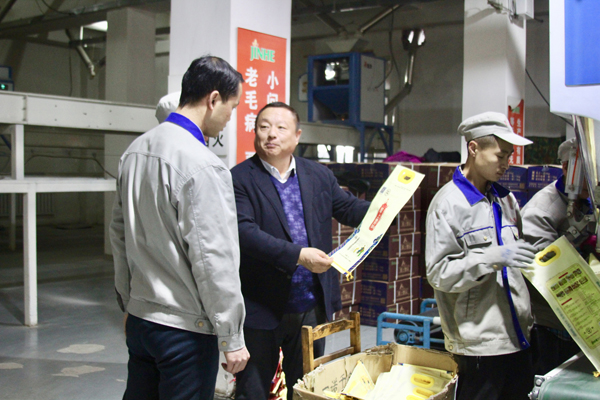 董事长李云辉在车间与工人交流「圣上壹品」大米热销,鼓励为国多产好大米场景。
