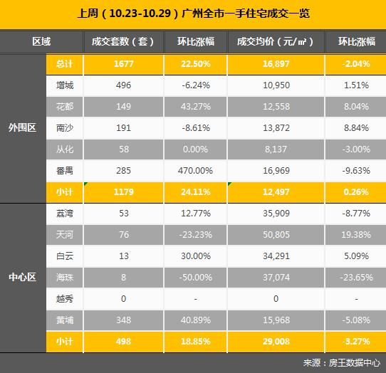【香港商报网讯】记者李苑立报道:据房王数据中心最新监测数据显示,上周(2017.10.23-10.29)广州全市共网签一手住宅1677套,环比前一周上涨了22.5%。网签均价为16897元/㎡,则环比前一周回落了2.04%。