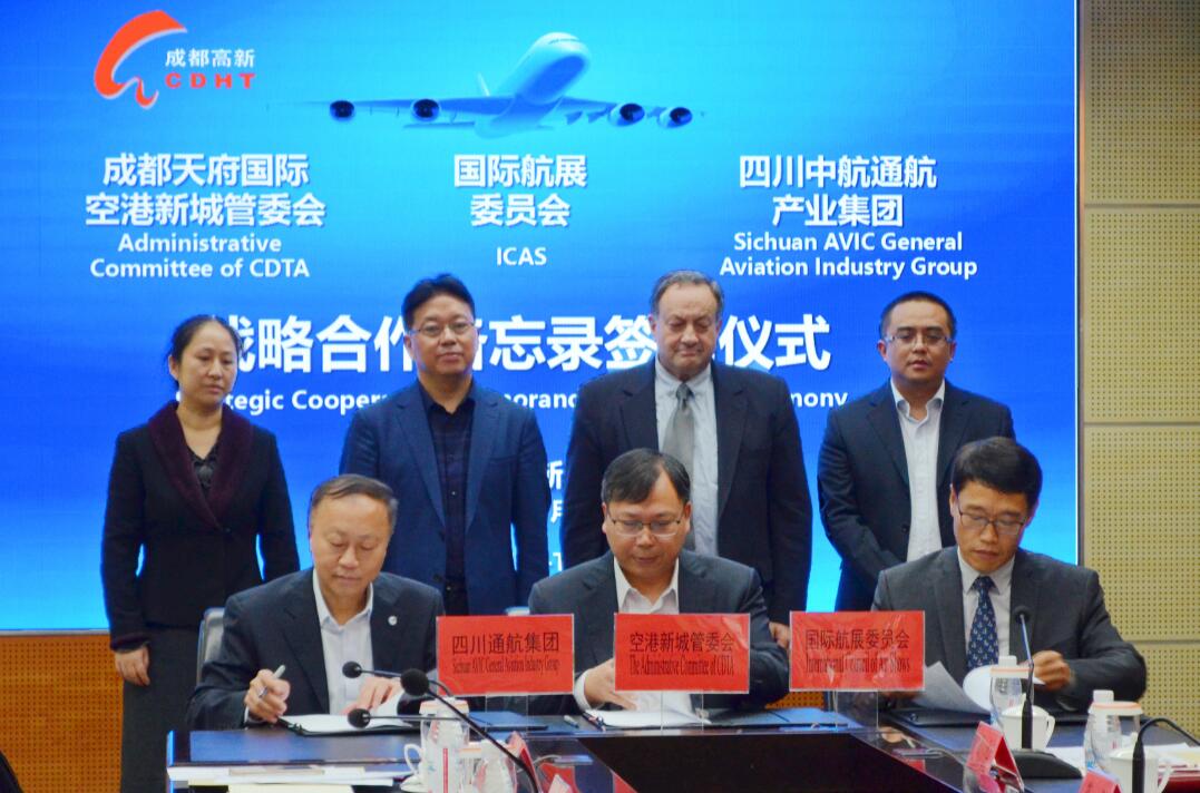 在当天的签约仪式上,成都天府国际空港新城管委会还与ICAS、四川中航通用航空产业集团有限公司(以下简称“四川通航”)签署合作备忘录。四川通航计划在成都天府国际空港新城建立四川通用航空产业发展中心和四川军民融合项目培育平台。