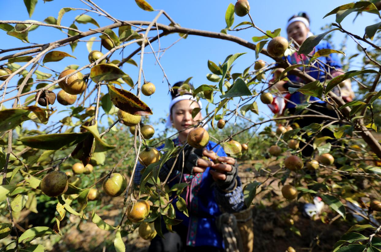 當日,100余名侗鄉婦女油茶林里分組采摘油茶果,曬豐收。目前,侗鄉60余萬畝油茶林進入采收旺季。