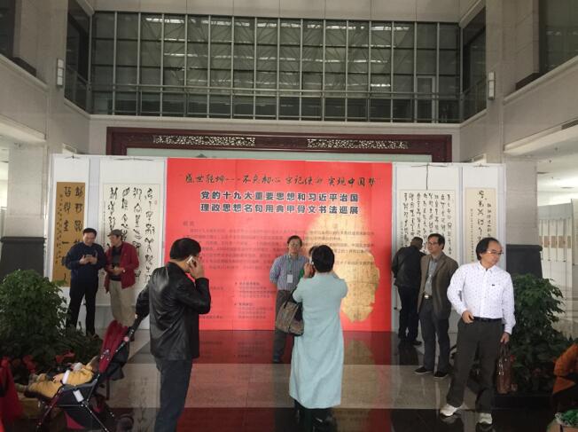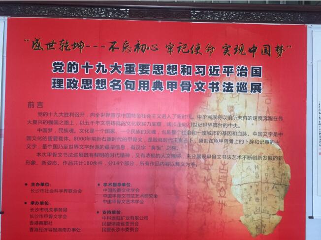 【香港商报网讯】记者赵启东、唐勇平报道:11月8日至18日,极具中华民族最优秀传统文字艺术的“‘盛世乾坤--不忘初心 牢记使命 实现中国梦’习近平治国理政思想名句用典甲骨文书法巡展首展”,在长沙市委办公大楼一楼大厅举行。此次展览,是把习近平总书记在中共“十九大”报告中的核心精神思想和各种讲话中引用过的135个中国古典诗文名句典故,邀请省、市甲骨文学会副会长以上具备中国书法家协会员资格的书法家和海内外甲骨文书法领军人物创作书写,有很高的艺术水平。展出的180余件甲骨文书法精品,将给重视中国优秀传统文化的有关领导、专家学者、广大群众和书法爱好者提供学习和参考。长沙市委宣传部部长高山观看了书展。