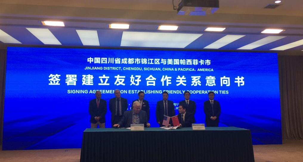 成都市锦江区与美国帕西菲卡市签订友好合作关系意向书。