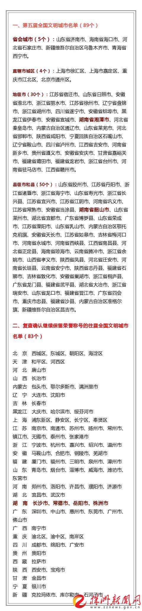 此次全国共有89个城市获得全国文明城市称号,包括湖南省湘潭市、韶山市。 全国83个往届全国文明城市通过复查确认继续保留全国文明城市荣誉称号 ,其中包括湖南省长沙市、常德市、岳阳市、株洲市,至此,湖南共有6个城市获评全国文明城市。