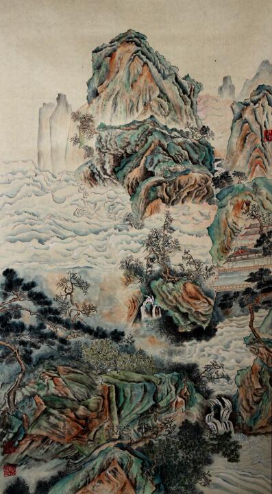 给记者留下深刻印象的便是其创作的《乔岳夏云图》,该作品是四季山水图的夏景图,一丝不苟的构图布局、数层渲染的设色技法,都体现出作者精心描绘的创作态度。作品色彩绚烂而不俗艳,厚重却不胶着,给人一种干净明快的印象。