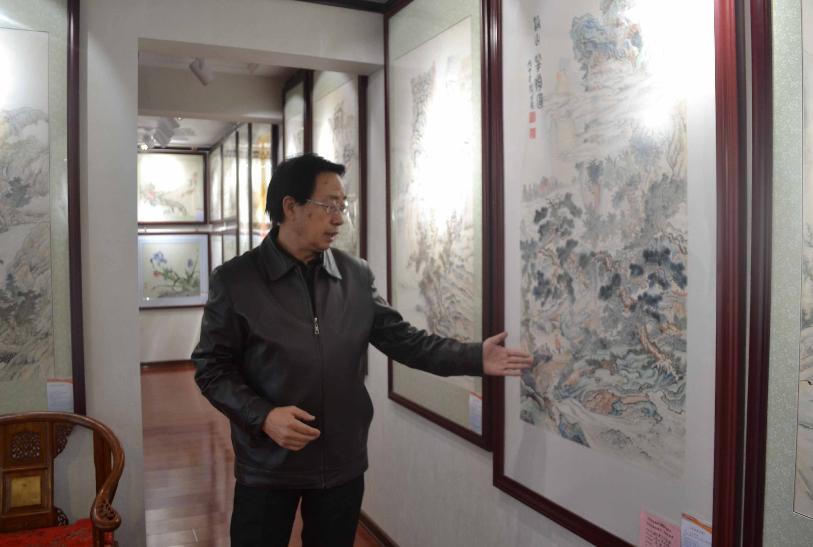 阎万贵向记者介绍其作品。