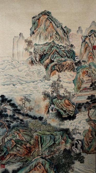 阎万贵 《云海仙山图》 绢本设色 130cm×70cm 2014年。