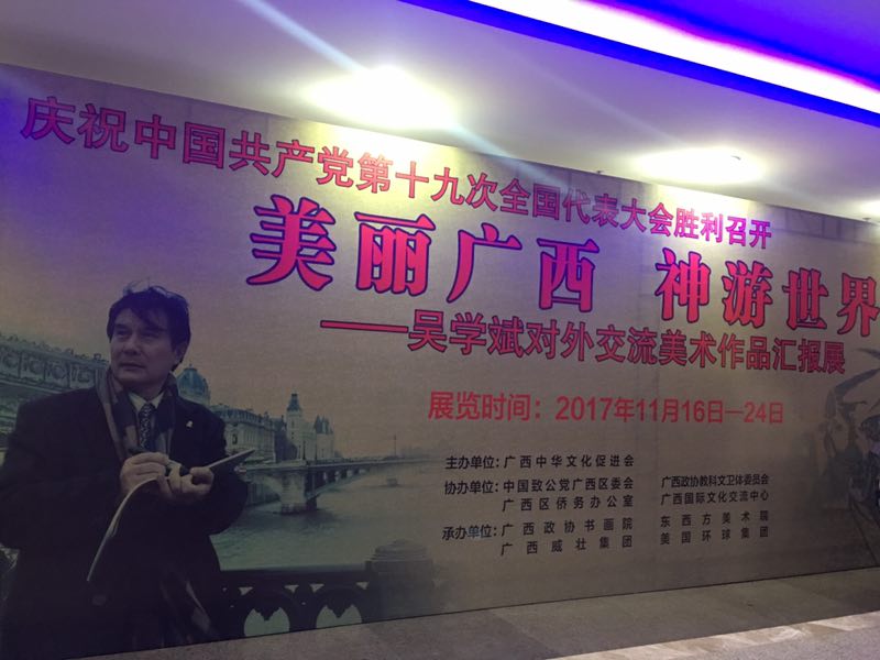 据了解,此次美术作品展以“喜庆十九大 讲广西故事 树文化自信 传中华文化”为主题,表达了吴学斌作为一名壮族的中国画家,始终不忘记自己的“中国画-世界梦”、“广西人-世界梦”, 他用手中的画笔,参与“一带一路”建设,以美术的形式把中华民族传统优秀文化推向世界。