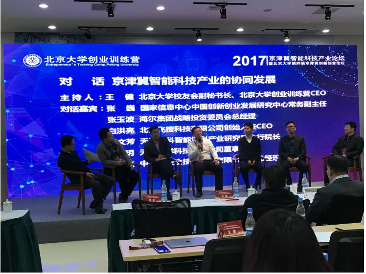 南开大学经济与社会发展研究院院长、国家京津冀协同发展顾问委员会专家刘秉镰作和科大讯飞集团总裁助理、科大讯飞AI双创发展研究中心主任方明分别做了主题演讲。在高峰圆桌对话环节,以“京津冀智能科技产业的协同发展”为题,由北京大学创业训练营CEO王健主持。国家信息中心中国创新创业发展研究中心常务副主任张巍、海尔集团战略投资委员会总经理张玉波、北京飞搜科技的创始人兼CEO白洪亮、天津中科智能识别产业研究院执行院长薛文芳、天津彼洋科技有限公司董事长崔玥和中海油安全技术服务有限公司副总经理熊亮参与对话,分别从政策、技术、应用等角度分享精彩观点,并就各方在天津空港经济区形成智能科技产业发展协同单位进行了深入探讨。