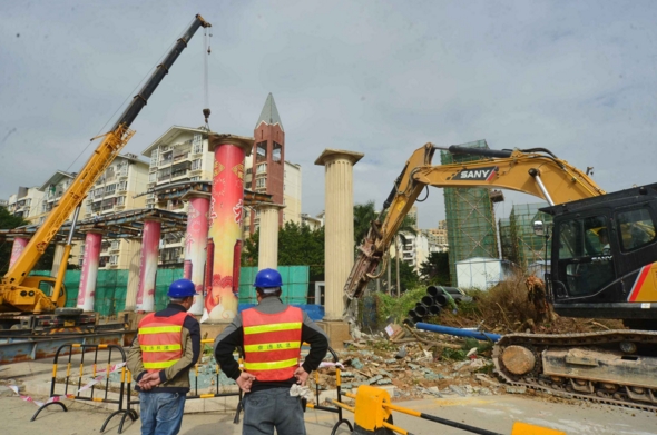 【香港商报网讯】记者朱开芝、通讯员周媛、李昌战、陈灿雄报道:日前,深圳市龙岗区布吉街道主要领导率执法、公安、交警、消防、应急分队、社区工作站等相关职能部门,依法拆除位于理想家园门口的12根罗马柱,确保罗岗片区南环路建设顺利推进。