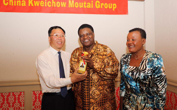 茅台集团党委书记、总经理李保芳向纳米比亚土地改革部长乌托尼夫妇赠送贵州茅台纪念酒