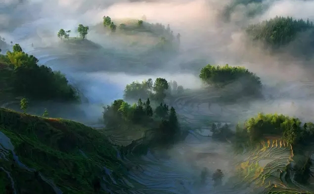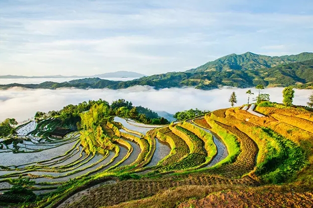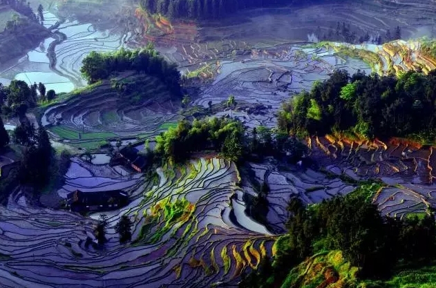 春天,梯田里注满了水,光滑如镜,千万亩梯田闪耀在阳光下,时有农人扶犁赶牛,慢慢悠悠的,自在悠闲,仿佛时光的脚步在这里格外缓慢。