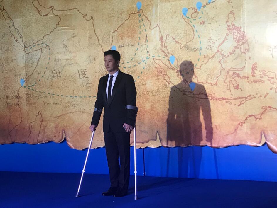电影节推广大使吴京,拄拐走上开幕蓝毯。