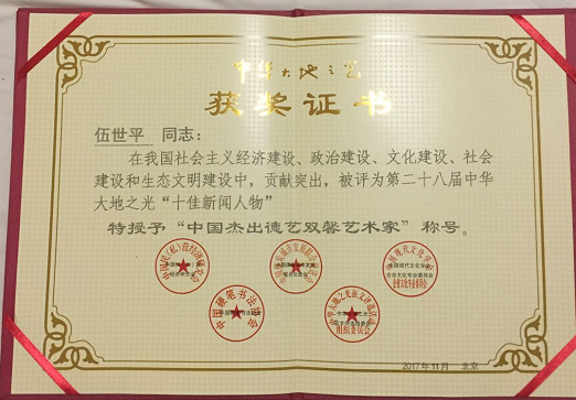 【香港商报网讯】11月26日,第28届中华大地之光表彰大会在北京·国家会议中心举行。来自全国各地的新闻人物、优秀奉献者、获奖作者、优秀校长、教练名师250余人济济一堂,第十一届全国人大副委员长周铁农会见了全体代表,为获奖者颁发奖杯,刘吉部长、苏希胜将军、袁苏凡会长、赵立凡副台长、阮观荣主任、倪同云副会长、郭子豪会长、李庆志总裁、褚多峰秘书长等领导出席。湖南省宁乡市书法家伍世平同志应邀参加了本次表彰大会,被评为第28届中华大地之光“十佳新闻人物”称号,并荣获“中国杰出德艺双馨艺术家”等殊荣。