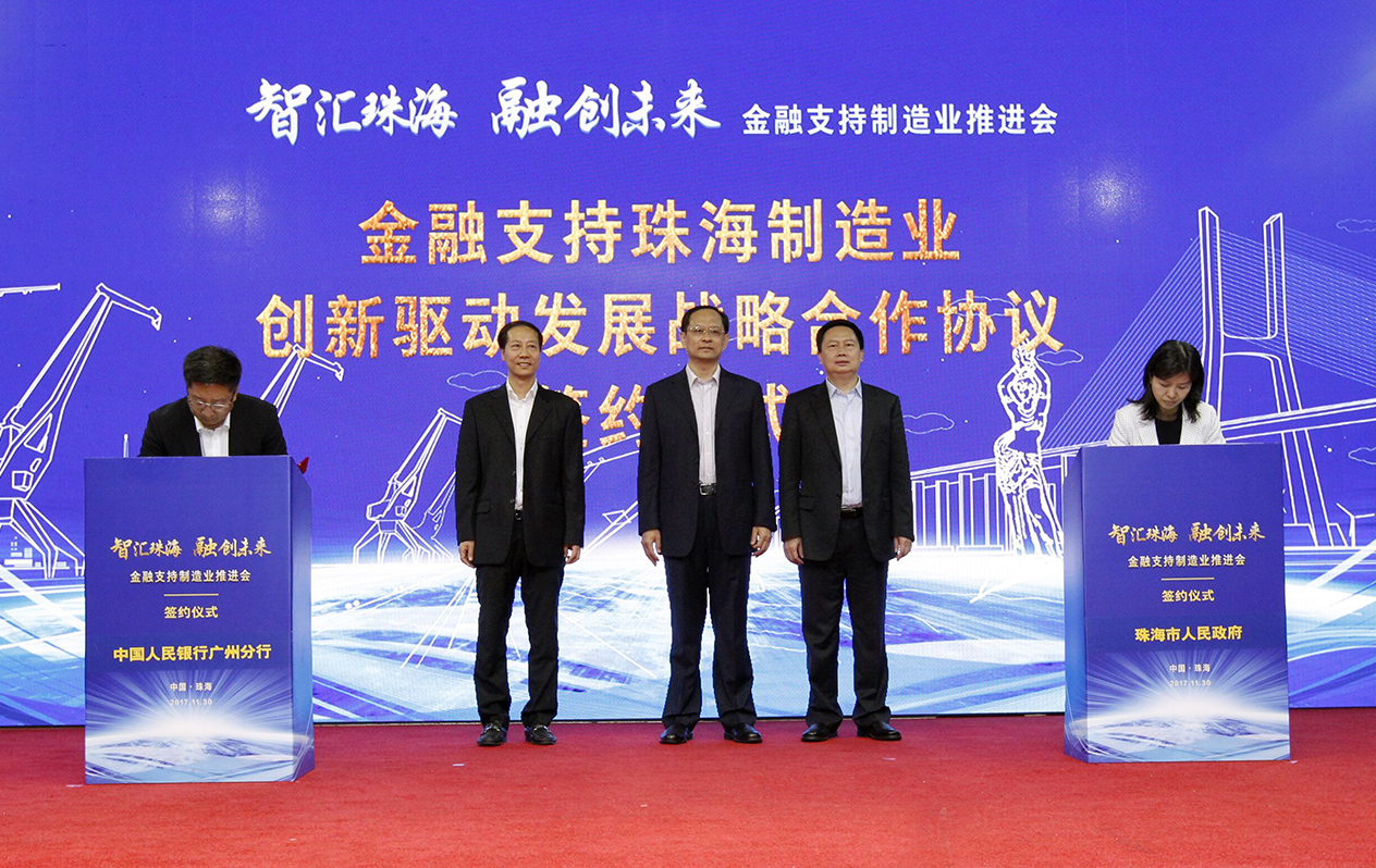 推进会上,中国人民银行广州分行与珠海市政府共同签署《金融支持珠海制造业创新驱动发展战略合作协议》,发挥银行的货币信贷政策引导作用和政府的统筹协调作用,形成地方政府与金融管理部门的优势互补,推动金融支持珠海市制造业创新驱动发展。6家银行机构代表共同发起行动倡议,号召珠海金融机构对制造业的科技创新和转型升级提供强有力的金融支持。珠海市知识产权金融创新服务基地在推进会上成立,并举行揭牌仪式。珠海11个金融支持制造业项目进行了现场签约,签约金额达148亿元。