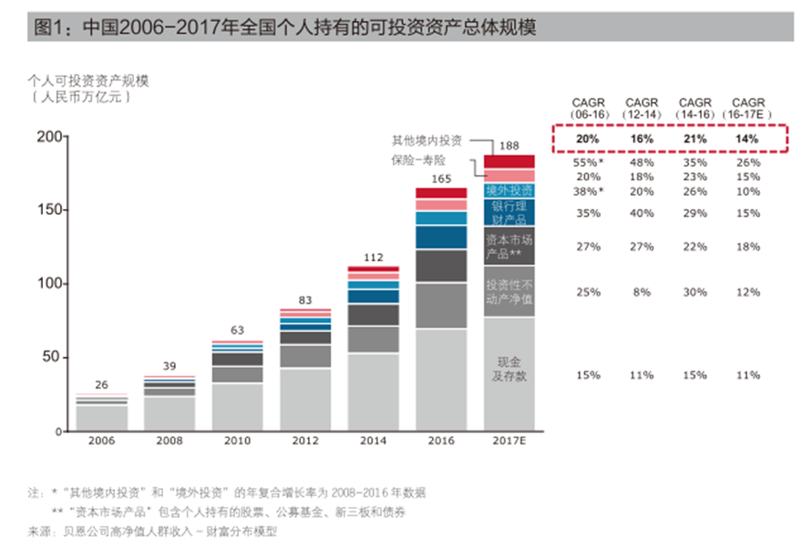 回顧過往,中國宏觀經濟發展在“新常態”下呈現L型走勢。 2015年全國GDP增速為6.9%,2016年放緩至6.7%,2017年政府工作報告將GDP增速目標設定在6.5%左右。在經濟L型運行的背景下,中國私人財富市場繼續保持高速增長。根據招商銀行及貝恩公司2017年的中國私人財富報告。2016年,中國個人持有的可投資資產總體規模達到165萬億元,而2014-2016年的年平均複合增長率為21%,繼2008-2010年後再次站上20%大關。其中,其他境內投資增速達35%,領先所有資產類別,私募證券基金、券商資管產品和互聯網金融等新興投資產品貢獻較大。