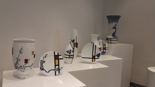 據了解,早年就讀於台灣師范大學美術系的關蘭同時接受過中西方美術的系統學習。既深入掌握了傳統中國花鳥畫的技法,又對西方現代抽象藝術進行了深入研究。在醴陵瓷穀展出的《當青花遇見蒙德裏安》系列正是關蘭對兩種藝術表現形式的思考後在創作。最終誕生了以黑線條劃分塊面,以紅黃藍色塊作輔助畫面,在白地上用傳統青花表現手法予以點題的作品。這種融合中西的創作手法讓青花瓷一下子煥發出嶄新的面貌,呈現出藝術當隨時代發展的特性。