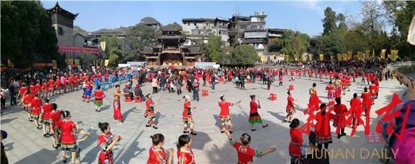 【香港商报网讯】记者肖建花 通讯员 孟春绒 向飞卿报道:清代诗人彭施铎,在《溪洲竹枝词》中描写的当时湘西土家族摆手舞的盛况,今天在芙蓉镇再现。