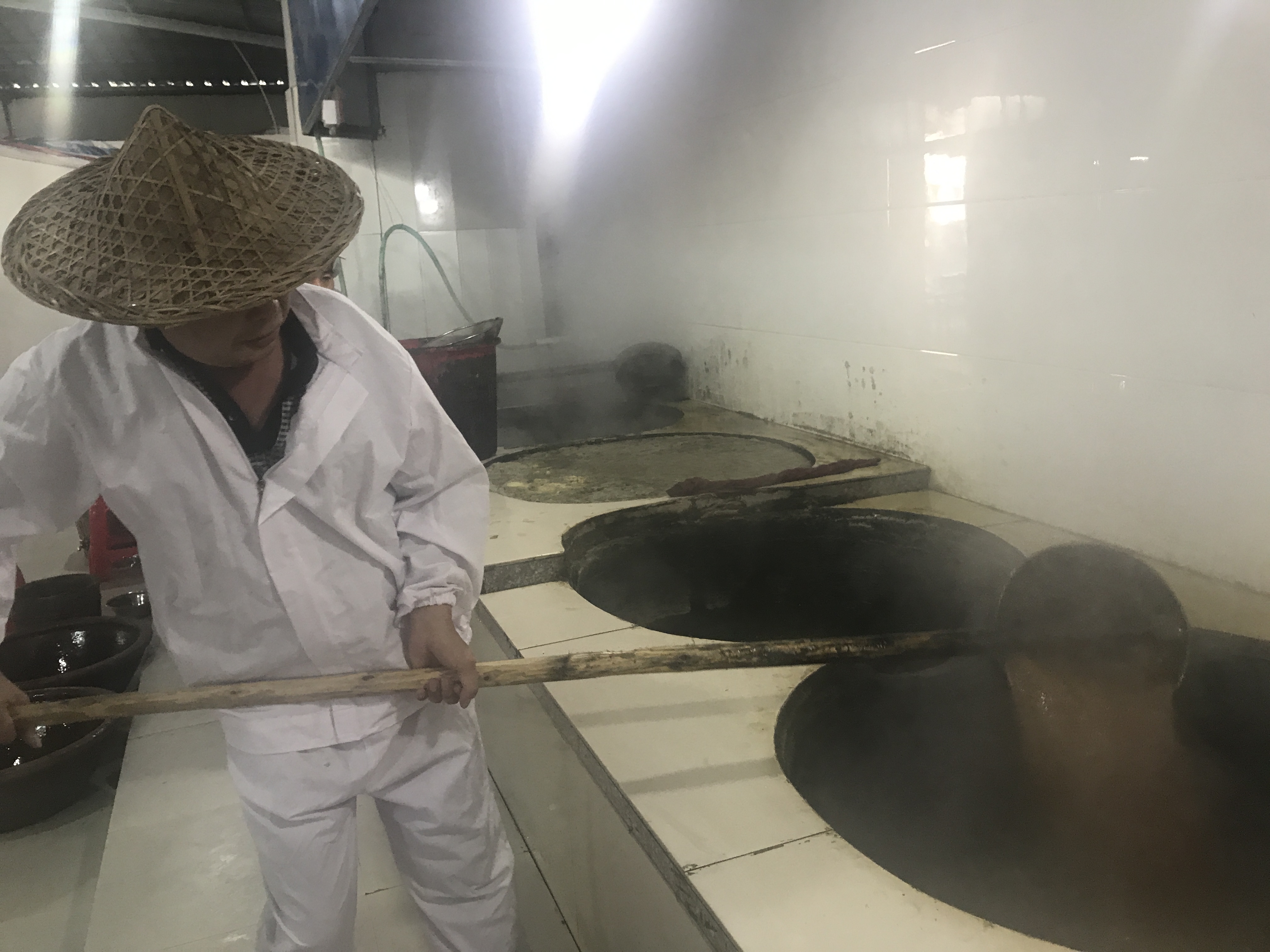 近日,记者驱车来到福建省宁德市福安市溪潭镇洪口村工业区。刚走进福安市柠喜古制糖业有限公司的厂房,就看到传说当中的“连环锅”。 ““连环锅” 是制作红糖采用的传统制糖工艺,从甘蔗取汁到红糖成型,全程都是物理方法。纯手工熬制,不掺杂任何添加剂,有些人看着工场环境可能觉得不够卫生,这也不能强求,反正我是比较喜欢这种传统的东西的。”红糖传承人林晋表示。
