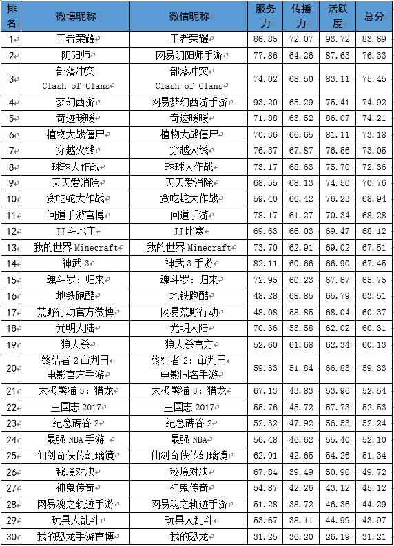 报告从传播力、服务力和活跃度三个维度分析移动游戏产品,揭晓了“移动游戏品牌传播影响力排行榜TOP30”。“王者荣耀”位居榜首,“阴阳师”排第二,“为了部落”排名第三。