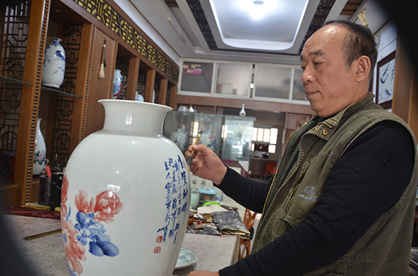 孙振峰在坯体上描绘釉下彩装饰纹样。