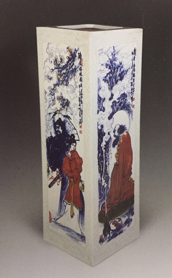 孙振峰致力于借助景德镇陶瓷的工艺,在瓷器上充分运用体现中国画的笔墨。借助国画与陶瓷绘画相融相通之处,以形写神,讲究线条的节奏韵律,形成点线面的三层对比,孙振峰的陶瓷创作别具一格。同时,其丰富的绘画经验,让其有了相对于景德镇老画工的优势存在。孙振峰表示:“景德镇的老画工从开始接触绘画开始就是在瓷器上直接绘画,自然形成了思维定式,而我没有,凭着多年的中国画绘画经验,在陶瓷绘画当中我将国画的绘画风格更加完美的融入到瓷器绘画之中,使创作出来的作品更具韵味。”