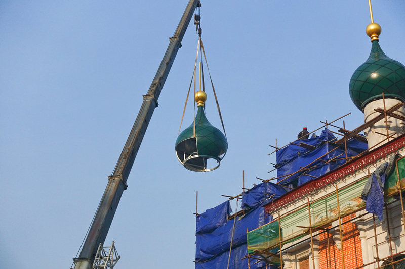 13日,记者上班途径此处,见到逐渐完善的哈尔滨火车站北广场教堂,工人们正在吊装教堂穹顶的“洋葱头”,标志着教堂的修建接近尾声。哈尔滨这座充满欧陆风情的城市,又增加了一处中西合璧的文化符号,哈尔滨正向颇具特色的国际大都市迈进。张晓磊、王成