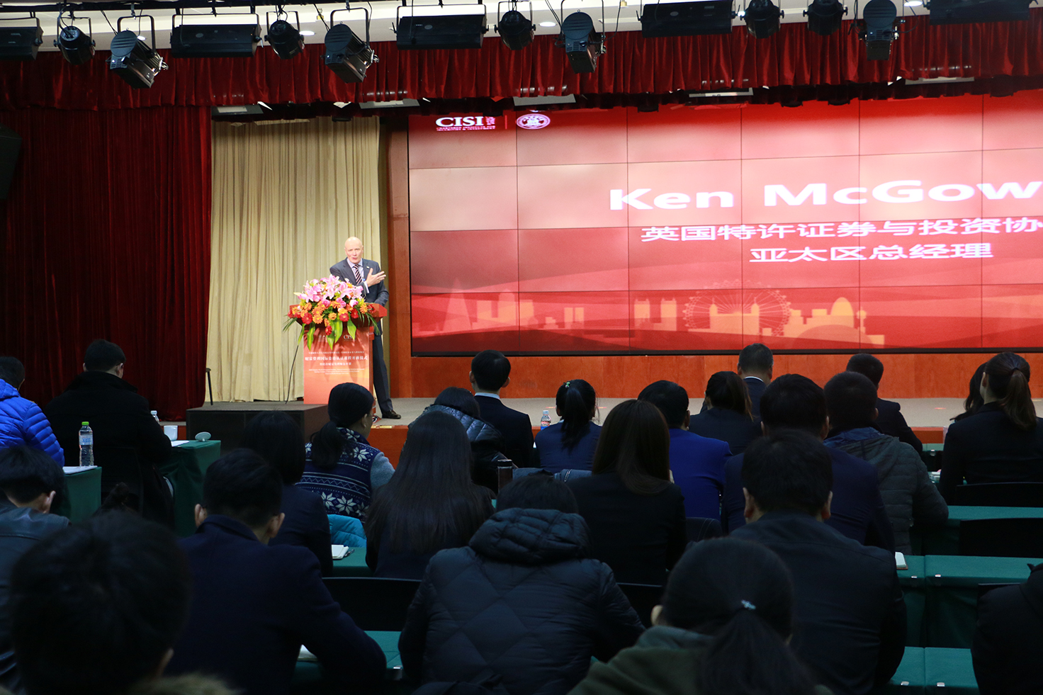 随后,英国特许证券与投资协会亚太区总经理Ken McGowan对各位学员的加入表示欢迎,并对CISI的发展历程、认证体系、会员制度及使命责任等方面做了详细介绍。“CISI将‘专业化’定义为行业知识,专业技能和行为规范的结合。完成国际资格认证后,学员们可以在签名时使用ACSI标志,这将清楚地表明学员具有值得信赖的财富管理专业人士的必备知识。”