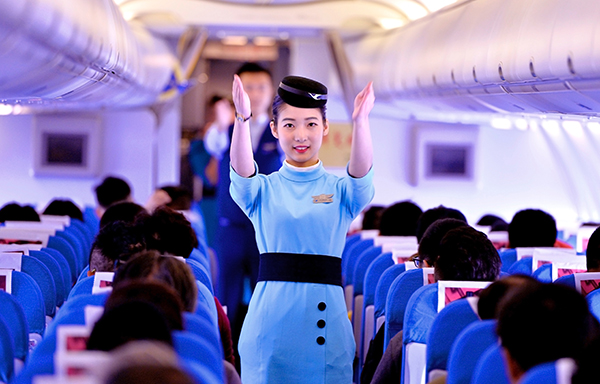 台籍空姐刘舒亚在航班上为旅客演示安全须知。贺晟摄