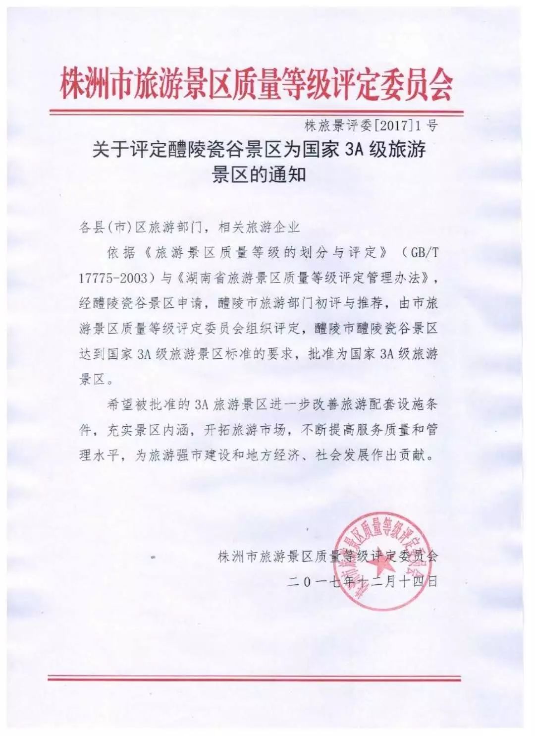 近日,株洲市旅游景区质量等级评定委员会依据中华人民共和国国家标准《旅游景区质量等级的划分与评定》与《湖南省旅游景区质量等级评定管理办法》,组织评定醴陵瓷谷获评国家3A级景区,这是醴陵市旅游景区迄今为止获得的最高等级的资质。