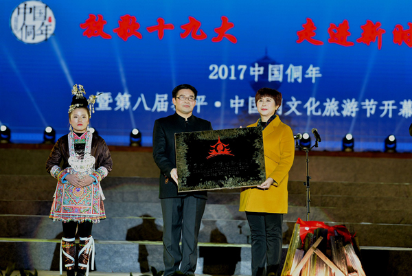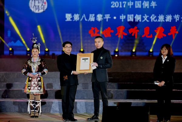 晚会现场,黔东南州委常委、州委宣传部部长,州委统战部部长潘玉凤为黎平县万人侗族大歌合唱团组成授牌,上海音乐学院、贵州省体育局、贵州旅游商会分别授予黎平县「上海音乐学院黎平县少数民族传统音乐采风创作基地」 「贵州省划骑跑运动基地」「贵州省摔跤训练基地」和「贵州省自驾联盟黎平县自驾游基地」 匾牌。