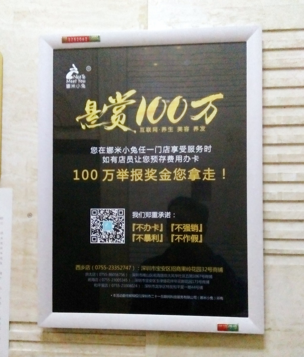 据深圳电视台都市频道12月19日的报道,娜米小兔悬赏100万让消费者举报向其推销办卡的员工。而此前的12月13日,该公司将此承诺发布到深圳各大社区及北环大道某处LED户外大屏。悬赏公告画面显示,娜米小兔自称新零售美业,专注互联网、养生、美容、养发,公开承诺“不办卡,不强销,不暴利,不作假”,如有消费者在店内消费时被店员推销办卡,举报后即可获得100万元奖励。