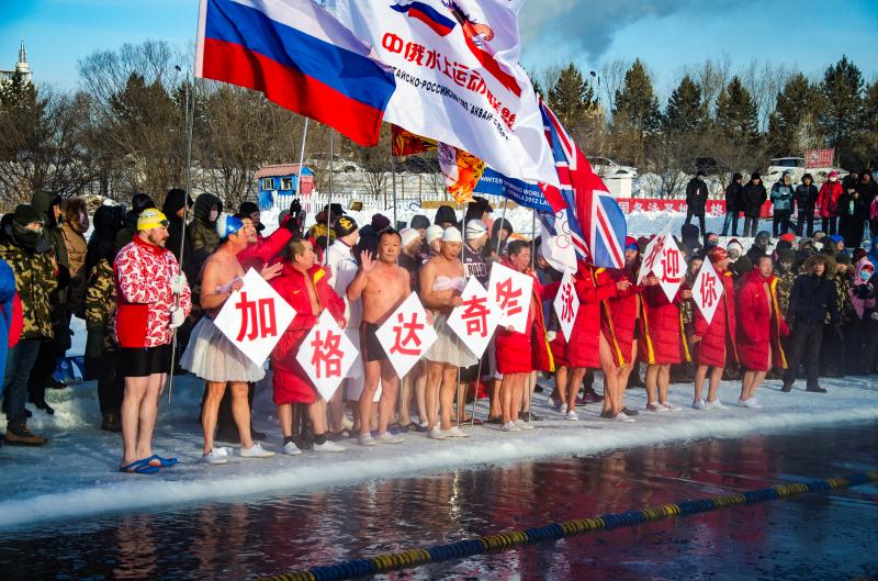 邀请赛现场,银装素裹的冰雪世界与湛蓝的天空完美相融,五颜六色的彩旗和大红灯笼飘荡在基地上空,桥下冬泳基地上室外温度达到零下29摄氏度,“泳士”们穿着薄薄的泳衣畅游在冰冷刺骨的河水中,一场场紧张而激烈的冬泳竞技赛吸引着越来越多的游客和市民前来观看。来自英国代表队的罗里说道:“我们家没有这么冷的天气,非常高兴能够中国,这的冰景太美了,我喜欢冬泳,在英国很难找到合适的地方,这的天也蓝,人也热情,就是太冷了,但是景色非常非常美,很奇妙,非常喜欢这里。”