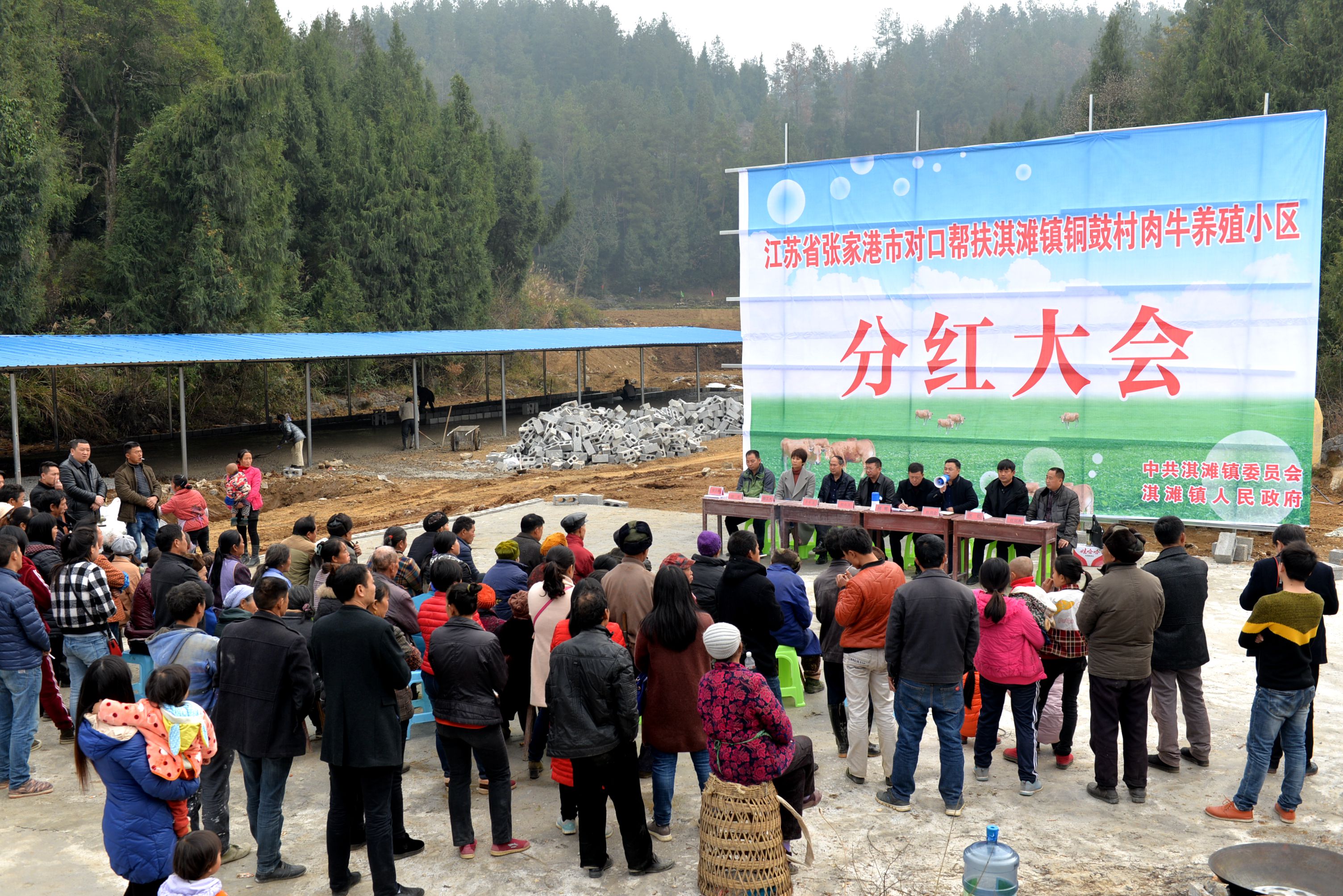 淇滩镇党委书记何明说,张家港80万元对口帮扶资金,是按每户7843.14元量化到102户建档立卡贫困户,用于入股贵州沿河梓瑜生态农业有限公司在该村扩建肉牛养殖基地,养殖肉牛100头以上,采取‘保底分红+股份分红’方式运行,这次分红是保底分红。项目建成可覆盖铜鼓村建档立卡贫困户102户,含务工收入在内,预计户均能增收2000元以上。