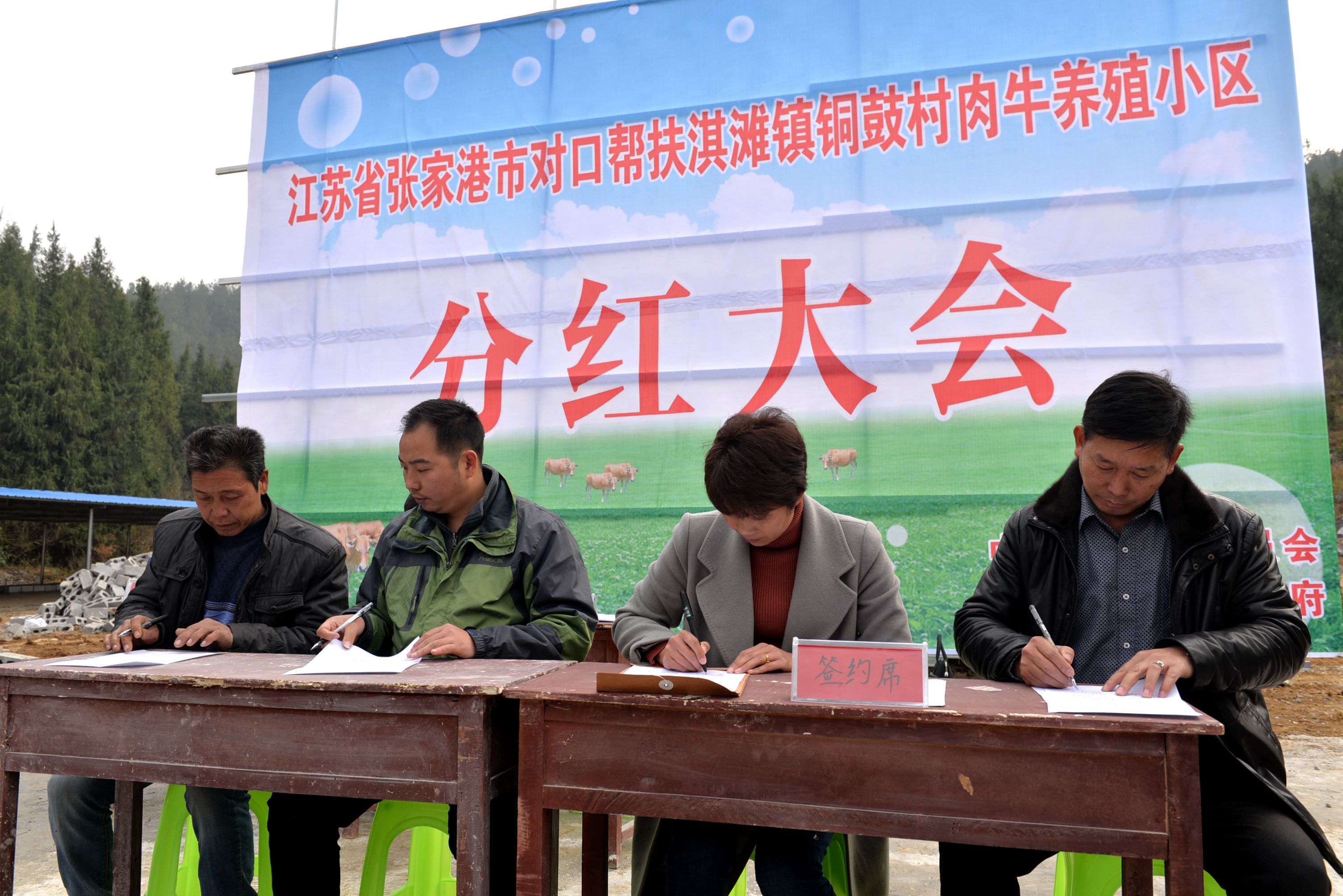 会上,淇滩镇政府、铜鼓村、养殖企业和贫困户签订了项目利益联结协议。