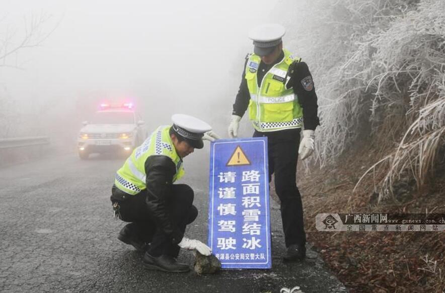 廣西新聞網桂林1月6日訊(記者陳創明 通訊員易璋 胡鑫坤)近日,桂北地區受持續低溫天氣影響,桂林資源縣隘門界、金紫山十裏坪坦、全州縣東山瑤族鄉等高寒山區出現美麗的霧淞自然景觀,當地交警及時派出警力到現場執勤,並在危險路段上放置警示牌,提醒前來欣賞霧淞的旅客和過往車輛注意交通安全。