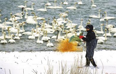1月6日,三门峡市天鹅湖景区管理人员在给天鹅投喂玉米。受连日降雪影响,天鹅湖被冰雪覆盖,天鹅觅食困难,景区投放4000斤玉米,帮助天鹅顺利过冬。记者王天定摄