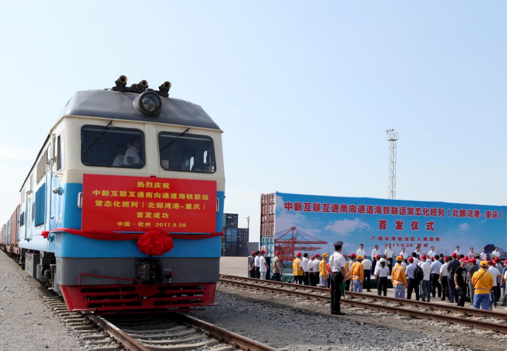 钦州保税港区内,开往重庆的海铁联运班列已实现双向常态化运行,“北部湾港-香港”天天班开行,至印度/中东远洋航线开通,“北部湾港-新加坡”天天班公共航线也已启动。
