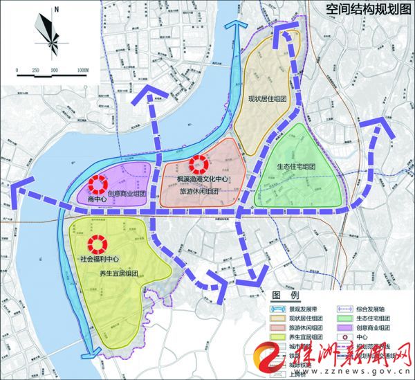 从空间结构上来看,规划形成“ 一带、三心、三轴、五组团”。“一带”是指由湘江沿线公共设施带与滨江绿地构成规划区的景观发展带;“三心”为商业中心、枫溪渔港文化中心和社会福利中心;“三轴”即为沿南环路、枫溪大道、江湾路-航空大道形成三条综合发展轴;“五组团”是指现状居住组团、生态住宅组团、旅游休闲组团、创意商业组团、养生宜居组团。