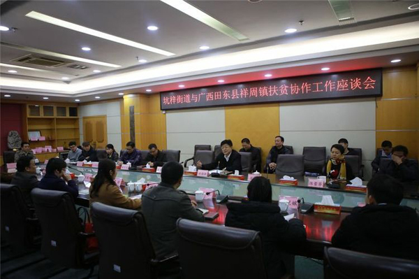 據了解,按照省、市、區對口扶貧工作安排,坑梓街道去年與廣西百色市田東縣祥周鎮達成結對幫扶工作對象,主要協助祥周鎮以及鎮裏的隴造村和聯合村開展脫貧攻堅工作。調研活動中,坑梓街道主要負責人向祥周鎮代表詳細介紹了坑梓街道的發展情況並表示,坑梓街道與祥周鎮有著深厚的感情和良好的合作基礎,雙方緊緊圍繞促進貧困群眾脫貧這一目標,積極在政府援助、產業合作、智力支持和社會幫扶等方面下功夫,形成了政府支持、對口援助、企業投資並舉的扶貧協作工作格局,取得了較好的脫貧攻堅成果。面向未來,雙方要進一步加強合作,因地制宜推動企業合作、產業發展,共同推進脫貧攻堅工作,今年計劃將邀請轄區內的部分企業代表到祥周鎮實地調研考察,共商扶貧事業。