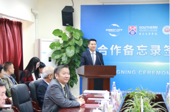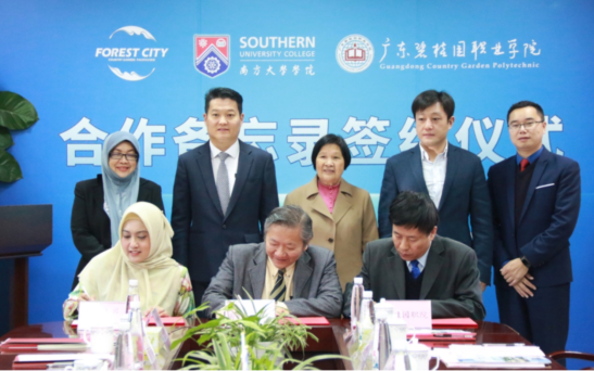 马来西亚柔佛州教育部私人与特殊教育单位总监Norbiha Binti Buang、广东碧桂园职业学院校监梁炽娟、广东清远市教育局高中与中职教育科负责人安鹏、广东省国强公益基金会副秘书长刘刚、碧桂园酒店管理公司培训发展部总监焦春苗以及南大学院、碧桂园职院、碧桂园集团、碧桂园森林城市方面等领导出席了签约仪式。