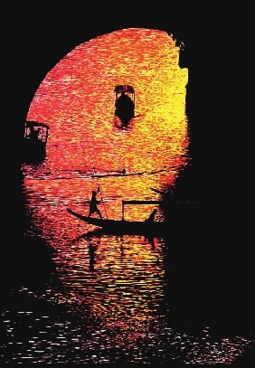 穿过雾霭的小舟,经过隐隐约约的白塔。