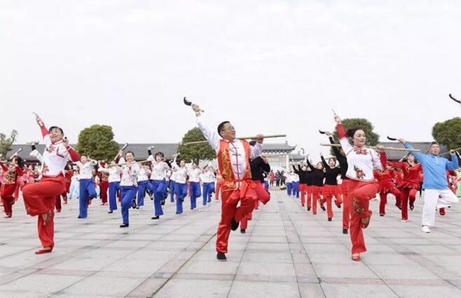 宜黄县舞蹈协会组织近500名广场舞爱好者在卓望山森林公园展演“禾杠舞”。(图片来自网络)