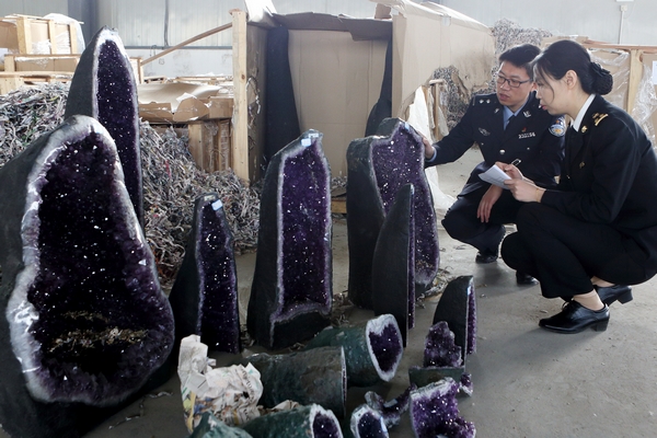连云港海关关员和缉私警察正在清点涉案水晶。 林军 摄