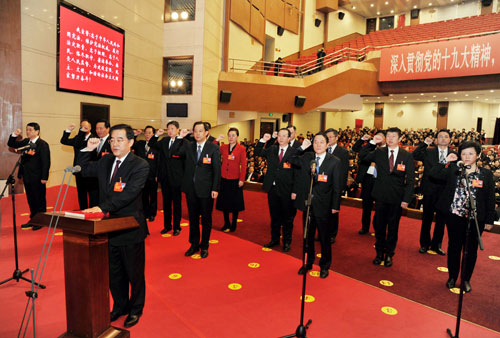 新当选人员在与会全体代表的见证下向宪法宣誓。黑龙江省委书记、省十三届人大常委主任张庆伟领誓。 徐旭 蒋国红 邵国良/摄