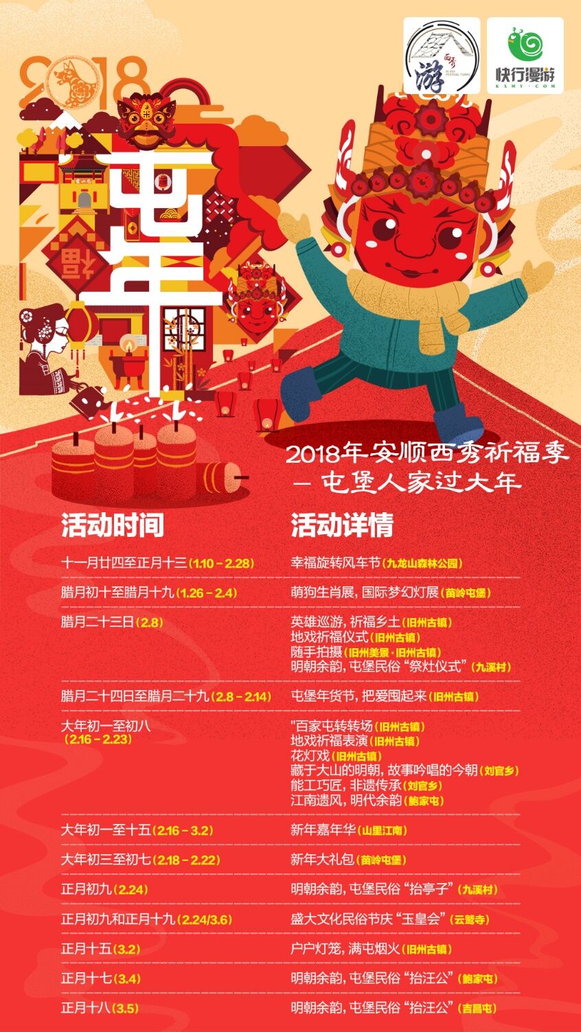 活动将持续到3月5日,在安顺旧州、九溪、鲍家屯、刘官乡等地,屯堡人家过年的习俗将得以完整的呈现,活动期间游客可以看屯景、吃屯味、购屯堡年货、参与热闹的西秀屯堡村落民俗活动。如地戏队伍巡游、屯堡地戏开箱祈福祭奠仪式、「祭灶仪式」、百家屯转转场、地戏祈福表演、花灯戏、唱书表演、、屯堡民俗「抬亭子」、盛大非遗文化民俗节庆「玉皇会」、屯堡民俗「抬汪公」等丰富多彩的屯堡民俗活动,让大家充分感受600年前的年味。